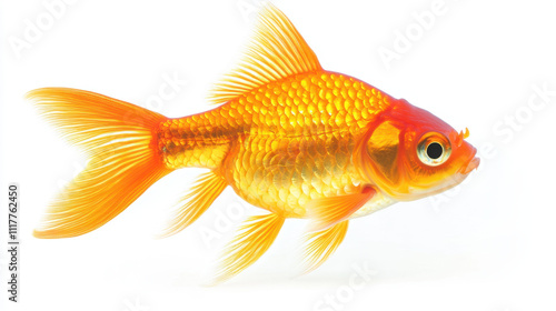 Vibrant goldfish swimming gracefully against a clean white background, showcasing its dazzling scales and flowing fins.
