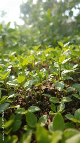 Vibrant green coffee seedlings sprout, thriving amidst lush foliage, spring,background,fresh