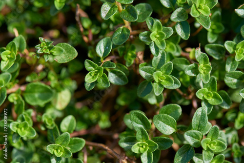 Vibrant green common garden thyme close-up.