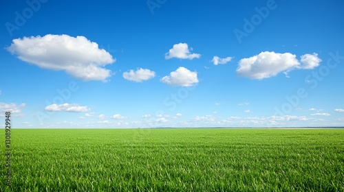Vibrant Green Field Under a Blue Sky with Fluffy White Clouds