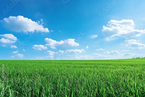 Vibrant Green Field Under a Bright Blue Sky with Fluffy White Clouds on Sunny Day