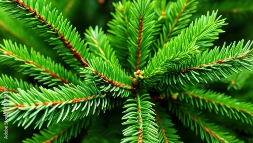 Vibrant green fir tree branches, macro photography, sharp needles, radial pattern, forest detail, natural symmetry, evergreen foliage, botanical close-up, lush texture, coniferous plant, fresh pine ne