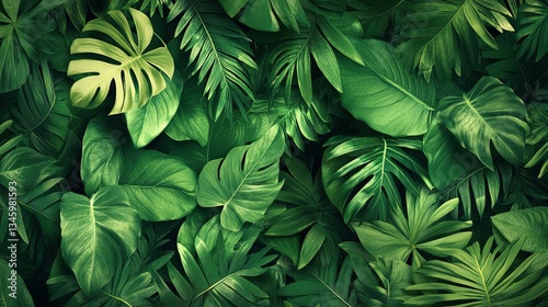 Vibrant green jungle leaves background, lush, tropical, organic, dense, vibrant, style of motif naive art, architecture style eco-friendly, color scheme green shades, overlapping leaves.