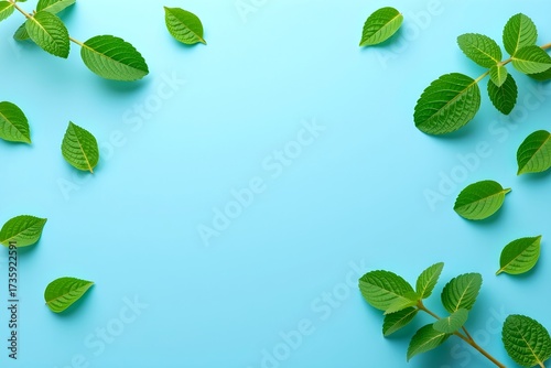 vibrant green leaves delicately arranged on a light blue surface, perfect for illustrating concepts such as freshness and growth