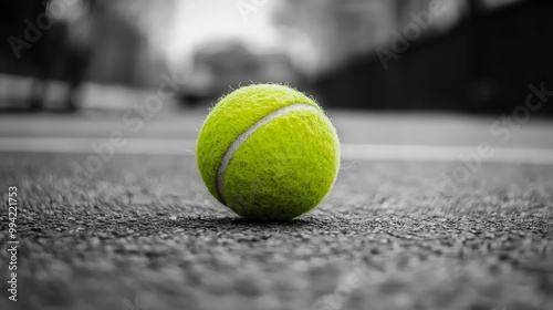 Vibrant Green Tennis Ball Contrasting with Gray Court Background :: Isolated Sports Equipment
