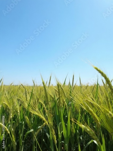 Vibrant green wheat field under clear blue sky on a sunny day, bright, horizon, field