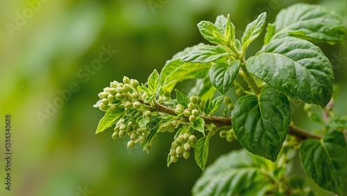 Vibrant herb branch with green buds and aromatic leaves embodying the essence of a lush garden