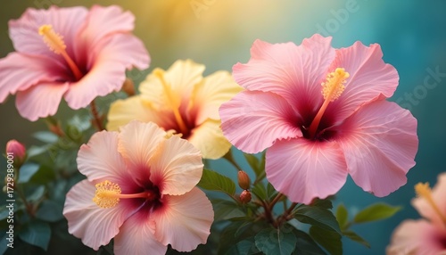 hibiscus, flower, bloom, pink, yellow, tropical, nature, beauty, floral, garden, flower petals, closeup, vibrant, summer, plant, foliage, macro, botanical, colourful, fresh, fragrant, detail, stamen, pistil, bud, growth, natural, background, bright, sunlight, hawaii, exotic, flora, blossom, closeup, delicate, texture, leaf, ornamental, aesthetic, harmony, serene, calm, peaceful, artistic, design, wallpaper, decoration, spring