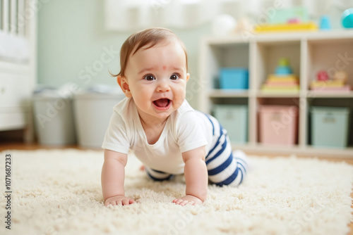 Vibrant high-quality scene of baby crawling on carpet scene, nursery-set and expression-curious