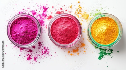 Vibrant Holi Powder Colors: Three glass jars filled with vibrant pink, red, and yellow Holi powder, with spills creating a colorful explosion. Perfect for festival celebrations and design projects.