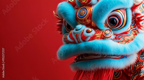 Vibrant lion dance costume against a rich red background, perfect for Chinese New Year celebrations, social media, and festive promotional designs.