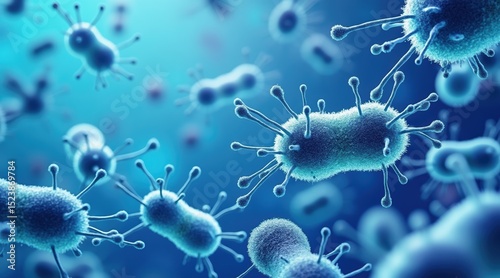 Vibrant microscopic view of bacteria in a blue environment.