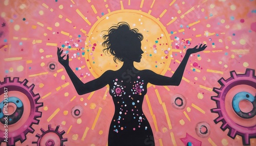 wallpainting, woman, silhouette, art, vibrant, colourful, creativity, expression, energetic, design, abstract, decoration, striking, modern, dynamic, empowerment, unique, character, playful, fantasy, culture, graphic design, positive, eye-catching, hand-painted, strength, joy, cheerful, imaginative, bold, inspiring, artistic, blooming, geometric, fantasy art
