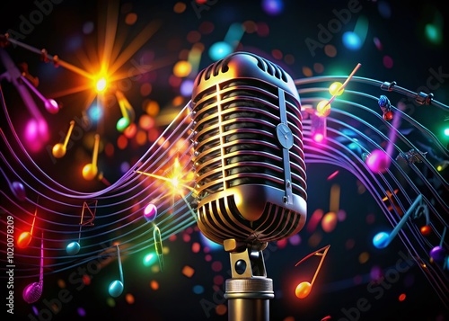 Vibrant Music Notes Surrounding a Classic Microphone on a Dark Background for Creative Inspiration
