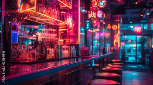 bar, night, neon, light, city, nightlife, club, alcohol, drink, interior, pink, purple, blue, red, vibrant, colourful, dark, illuminated, modern, stylish, seating, counter, bottle, goggles, shiny, glossy, urban, evening, scene, entertainment, pub, lounge, cocktail, atmosphere, mood, energy, vibe, bright, shadow, texture, design, aesthetic, signs