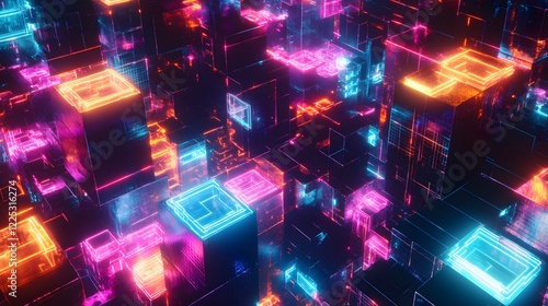 neon, city landscape, three-dimensional, glowing, block, futuristic, technology, abstract, digital, light, vibrant, colourful, pattern, visual, geometric, design, innovation, urban, landscape, illuminated, shiny, mysterious, cyber, network, bright, aethereal, element, depth, architecture, scenery, night, surreal, space, simulation, visualisation, creative, modern, structure, graphic, artwork, artistic, aesthetic, colours, effect, aglow, environment, dynamic, concept