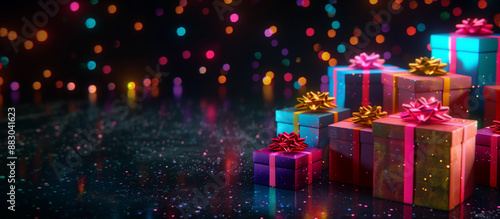 neon, glowing, gift, box, box, pile, dark background, copy, space, futuristic, vibrant, black, friday, sale, event, promo, banner, blank, background, modern, cardboard box, celebration, special occasion, holiday, birthday, high technology, sleek, contemporary, stylish, eye-catching, bold, colourful, dynamic, aglow, illuminated, edgy, trendy, abstract, statement, creative, unique, distinctive, polished, organised, digital, bright, reflective