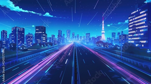 Vibrant night highway with light trails stretching towards the illuminated city skyline. The mesmerizing view of a busy thoroughfare at night, where the streaks of light from vehicles create a beautif