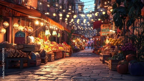 market, shopping, stall, night, illumination, lantern, souvenir, spice, fruit, vegetable, basket, product, merchandise, sale, commerce, exchange, bargain, haggle, barter, trade, seller, seller, buyer, crowd, street