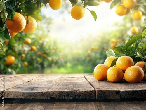 Vibrant orange grove vista with rustic wooden table and sunlit foliage creating a fresh and inviting scene for healthy eating and natural beauty