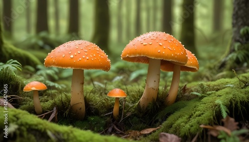 Vibrant orange mushrooms with white spots thrive in a mossy forest environment, creating a beautiful natural scene.