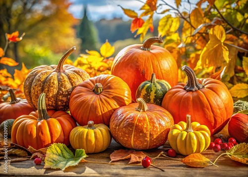 Vibrant orange pumpkins and gourds of various sizes arranged amidst rustling dry leaves and verdant vines on a