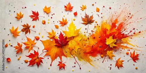 Vibrant orange, yellow, and red paint splatters on a white canvas, evoking the whimsical beauty of autumn leaves gently falling, surrounded by subtle texture and nuance.