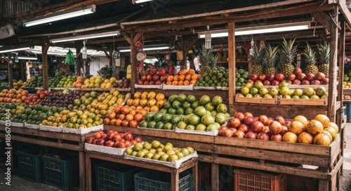 Vibrant outdoor fruit market stalls brimming with colorful, diverse tropical fruits