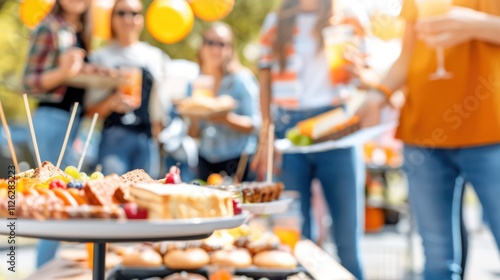 Vibrant Outdoor Gathering with Delicious Food and Drinks at a Festive Party with Friends Enjoying a Bright Day Under the Sun and Colorful Decorations