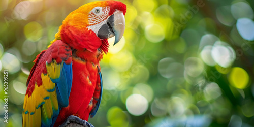 Vibrant Parrot Perched on a Branch with Red and Blue Feathers