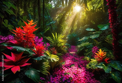 vibrant patterns textures lush jungle foliage reflecting diverse flora rich colors, biozone, biodiversity, botanical, canopy, climbing, creeper