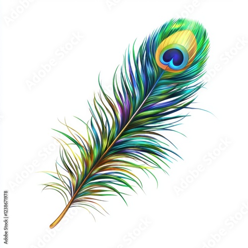 Vibrant peacock feather with iridescent hues isolated on white background