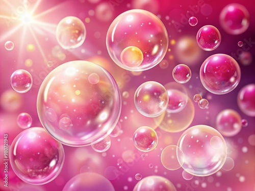 Vibrant pink background showcases delicate, translucent soap bubbles in various sizes, glistening with dew, suspended in mid-air, creating a whimsical and captivating visual effect.