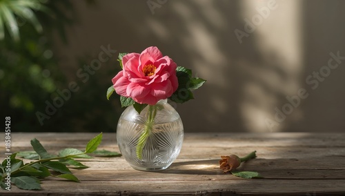 Vibrant pink bloom with foliage in a glass container placed on wood surface, highlighting floral freshness, World Flower Day