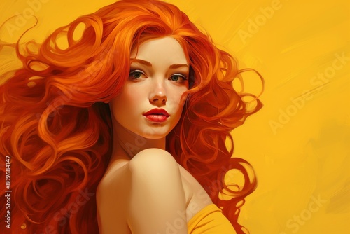 woman, redhead, beauty, portrait, red, hair, vibrant, yellow, background, striking, feature, flowing, fiery, illustration, digital, painting, female, elegance, stylish, fashion, close, up, glamour, artistic, long, curly, orange, nature, femininity, care, coiffure, young, adult, bright, colours, creative, face, exquisite, make-up, sensuality, bold, colours, lip, gaze, mystique, intense, allure, model, individuality