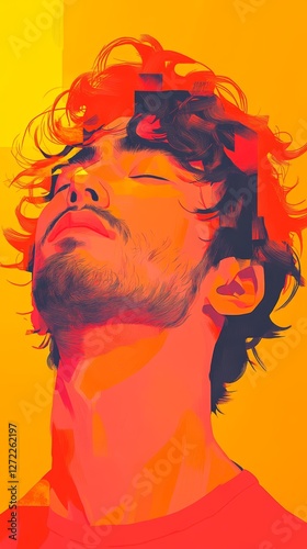 man, portrait, digital artwork, illustration, stylised, graphic, vibrant, colourful, orange, red, young, male, dark hair, closed eyes, serene, tranquil, contemplation, bold, artistic, modern, contemporary, abstract, expression, mood