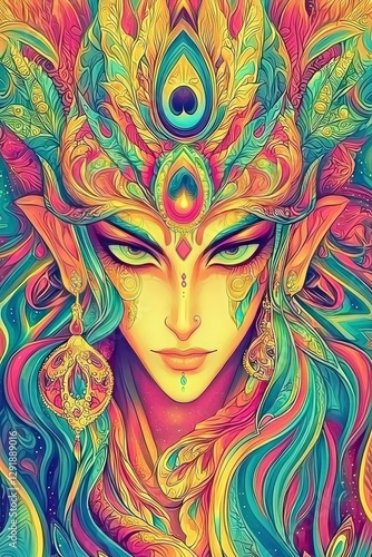 Vibrant Psychedelic Goddess Ornate Headdress and Jewel-Toned Hair