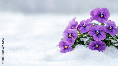 Vibrant purple flowers emerge through a blanket of snow symbolizing the arrival of spring. The delicate blooms add a striking contrast to the cold white background enhancing the serene landscape