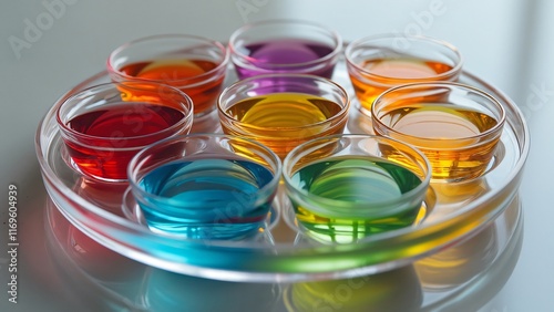 Vibrant Rainbow Colored Liquids in Glass Bowls