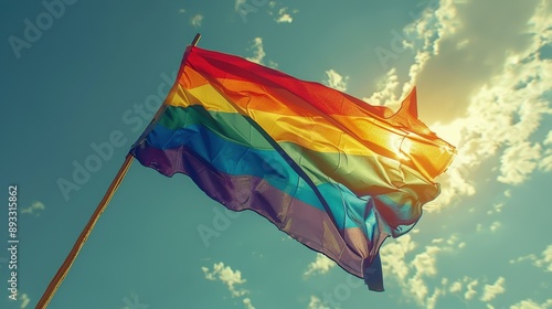rainbow, flag, waving, blue, sky, vibrant, symbol, pride, equality, colourful, spectrum, symbolic, freedom, movement, diversity, right, symbolism, many-coloured, expression, wind, cloud, celebration, identity, community, love, inclusion