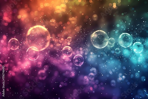 Vibrant rainbow-colored abstract background with glossy water droplets and a shimmering effect.