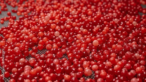 Vibrant red cranberries cascading on a mesh belt conveyor under bright light perfect for food industry or harvest concept