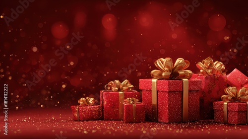Vibrant Red Gift Boxes with Silver Ribbons Stacked and Scattered Against a Festive Red Background for Christmas, Celebration, and Holiday Gift Giving