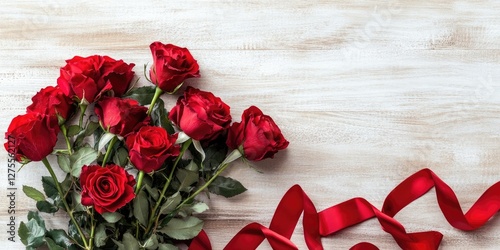 Vibrant red roses arranged elegantly on a textured wooden surface with flowing red ribbon creating a romantic and festive atmosphere