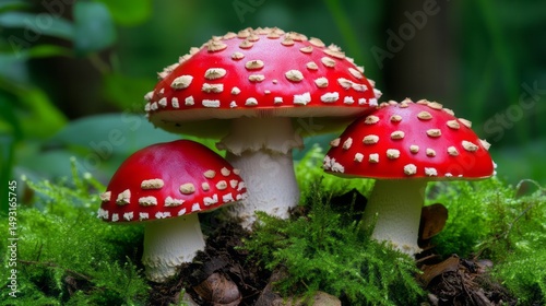 Vibrant Red Toadstool Mushrooms on Green Moss in a Lush Forest Setting