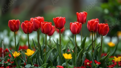 Vibrant red tulips blooming in a garden, amidst smaller yellow and red flowers, against a blurred green background