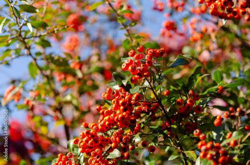 Vibrant ripe orange red rowan berries on a rowan tree branches bottom up view, rowan berries in summer autumn garden