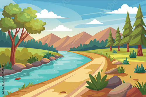 nature, landscape, river, vector, mountain, scenery, pine, forest, path, illustration, greenery, blue, sky, cloud, summer, scene, cartoon, scenic, view, countryside, travel, background, hiking, trail, natural, beauty, art, peaceful, setting, waterscape
