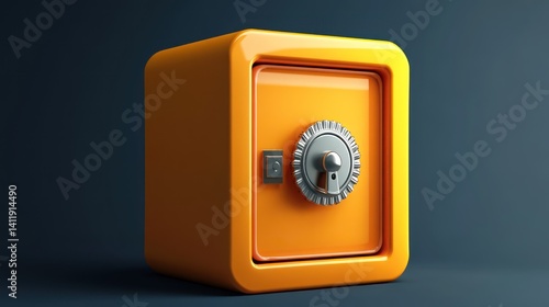 safe, security, vault, financial, banking, savings, deposit, protection, money, wealth, container, orange, metallic, storage, metal, investment, secure, confidential, lock, equipment, steel, strongbox, treasure, locked, safety, combination, box, cube, solid, cartoon, isolated, illustration, three-dimensional, economy, insurance, business, capital, cache