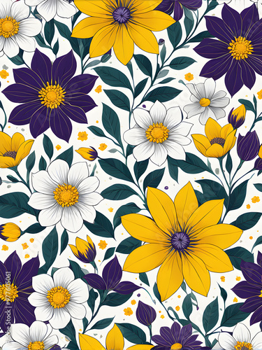 yellow flower, purple flower, white background, green leaf, flower petals, textile design, colorful flowers
